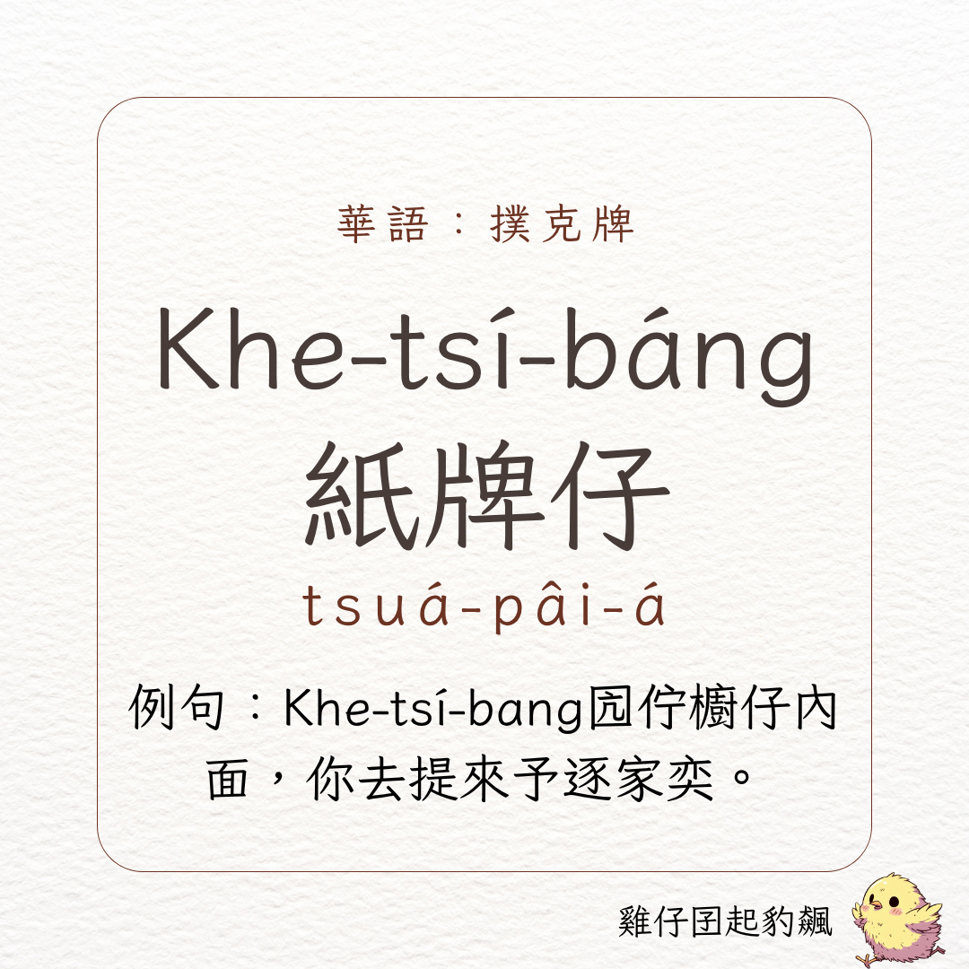 『撲克牌』通世界攏是足普遍ê一種紙牌仔,對筊間到厝內攏袂當欠這項物。連筆者前一站仔看ê一齣日劇《今際之國ê Á-lī-sù》1都是以『撲克牌』做主題。毋過,你敢知影咱台灣人按怎稱呼伊咧?